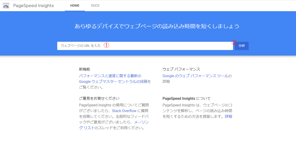 - ウェブページのURLを入力の欄に測定するサイトのURLを記入