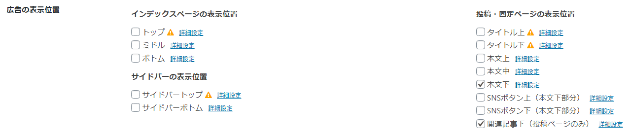 上記のように【本文下】【関連記事下】の2つに絞ることで多少の速度改善とサイトの見栄えが向上しています。